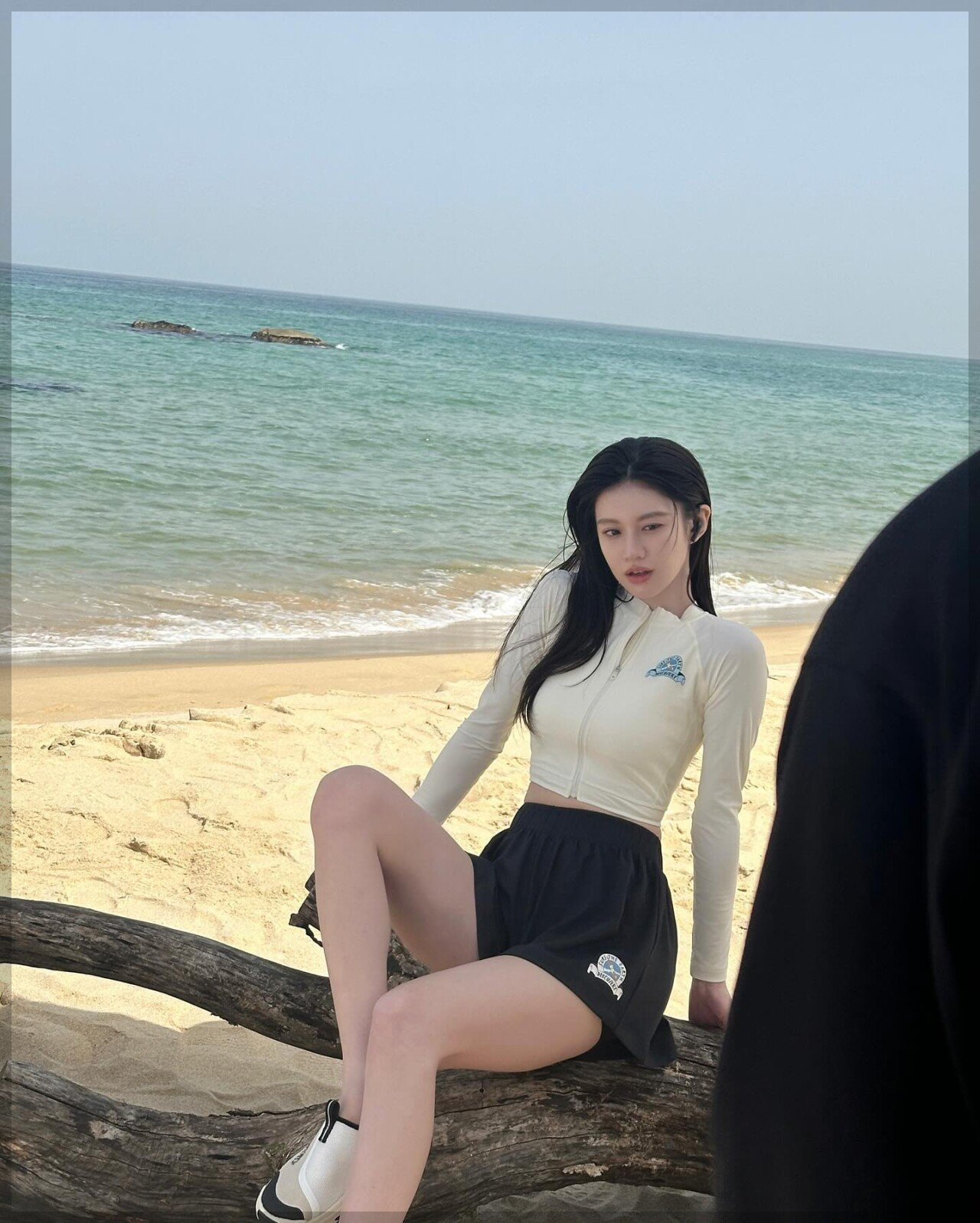▶ 이름이 좀 길긴 합니다만 고윤정 님이 입었던 아이보리색의 크롭 한 기장감의 집업 래시가드와 블랙 스커트를 서로