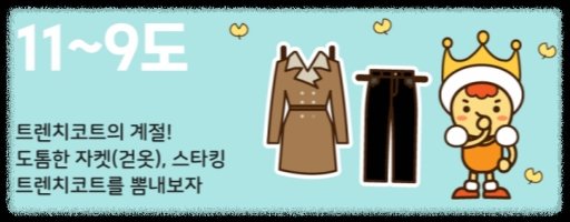 본격적으로 따뜻함을 느낄 수 있는 날씨이며, 가벼운 외투를 추천드립니다. 기온에 맞게 트렌치코트, 트위드, 청재킷등을
